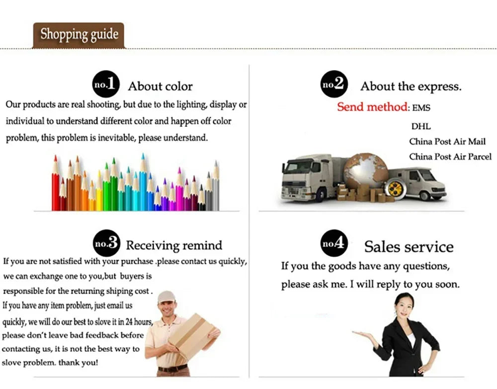 2. If the products you received was damaged or wrong styles, please don't leave any negative feedbacks first, kindly please contact us,we will deal with it and work out the best solutions, Your satisfication is our motion to do better.